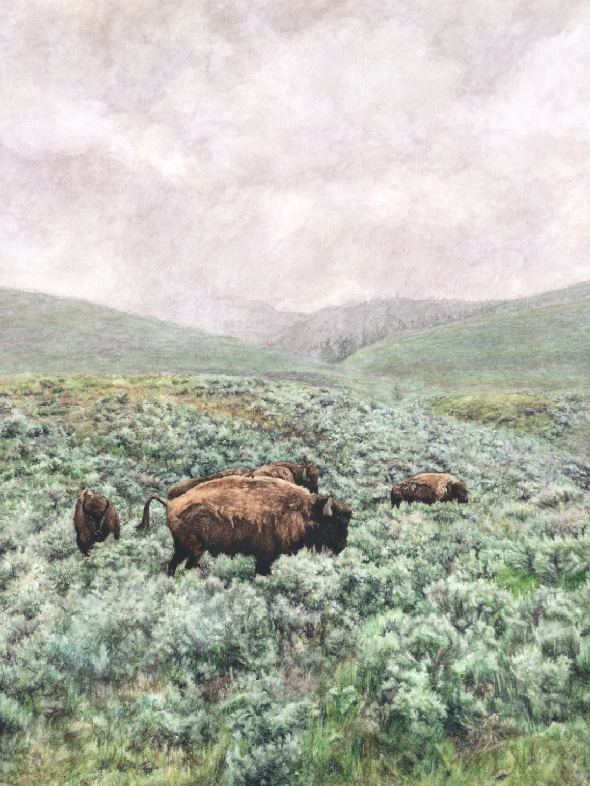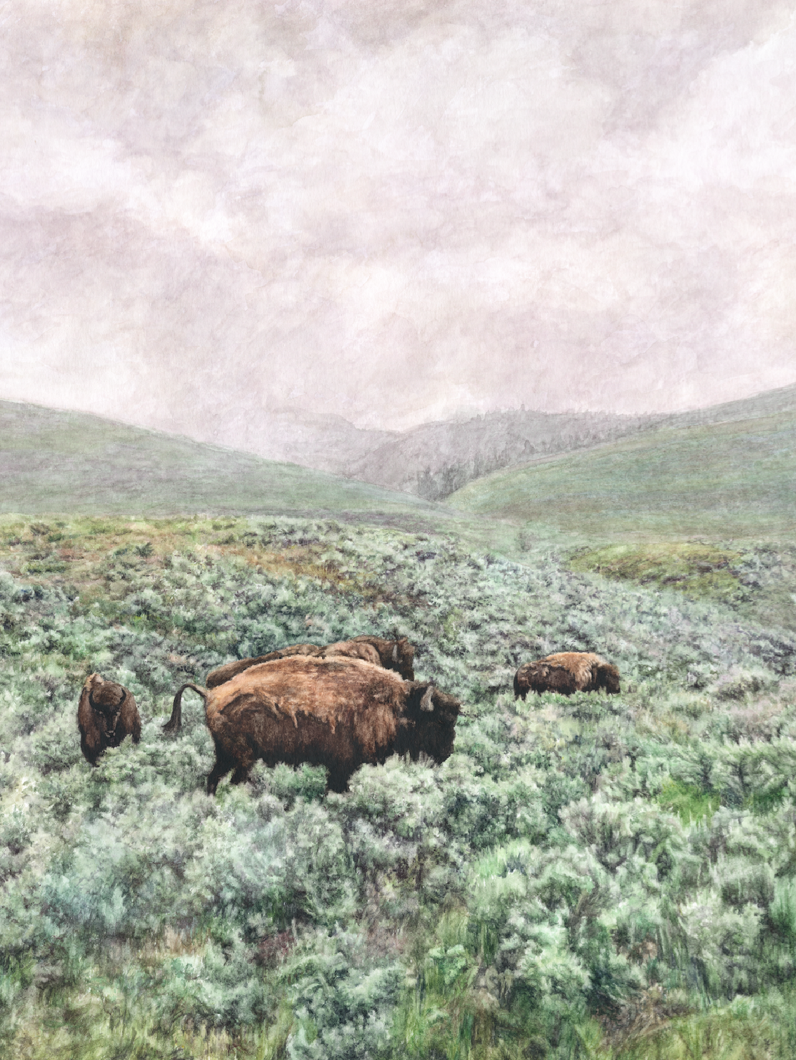 A calming and whimsical watercolor painting of moving buffalo in Yellowstone National Park